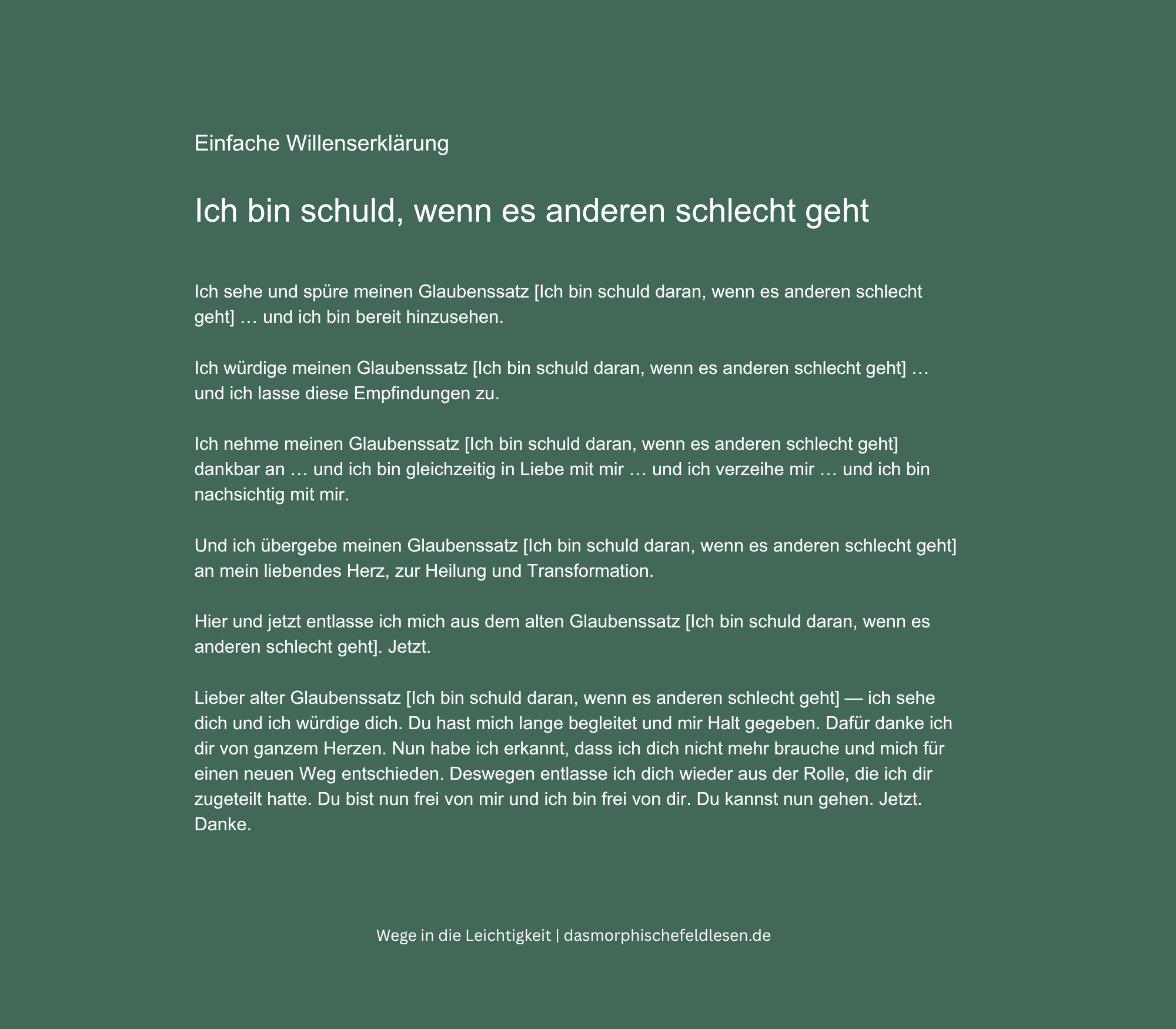 Wenn dich Annikas Geschichte berührt hat und du spürst, dass das Thema auch dich betrifft, kannst du dir hier etwas mitnehmen. Was folgt, ist eine einfache Willenserklärung — nicht die individuelle, die Annika gesprochen hat, aber ein erster eigener Schritt in dieselbe Richtung. Sprich sie laut aus, wenn du magst, und nimm wahr, was sie in dir bewegt. Du findest sie auch als Audio, falls du sie lieber hören und nachsprechen möchtest.